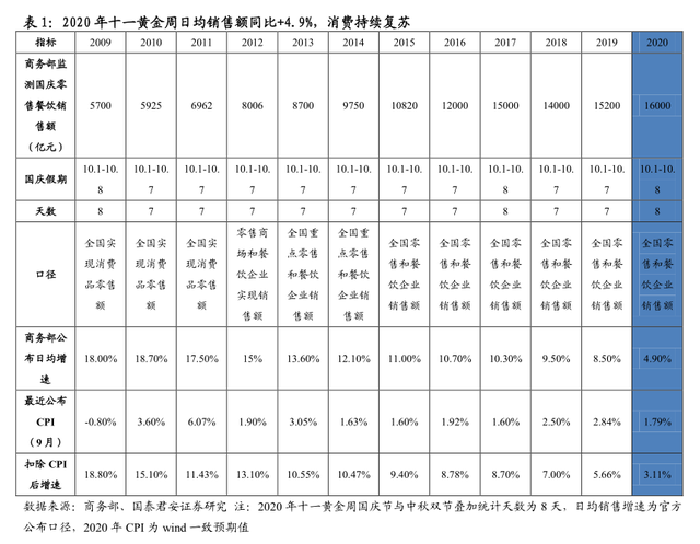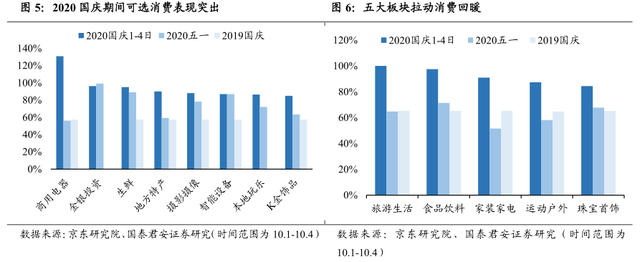 國泰君安表示,疫情對可選消費的短期抑制得到釋放,婚禮延期的置辦需求在黃金週期間爆發。旅遊生活、家裝家電、食品飲料、珠寶首飾等板塊貢獻較大,拉動消費回暖。