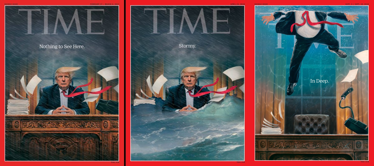奧布萊恩此前也為該雜誌創作了一系列特朗普的封面作品。下圖從左到右依次是《這兒沒什麼好看的》(Nothing to See Here)(2017年2月27日封面)、《暴風雨》(Stormy)(2018年4月23日封面)和《深陷其中》(In Deep)(2018年9月3日)。
