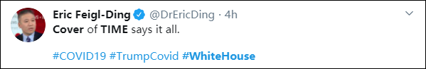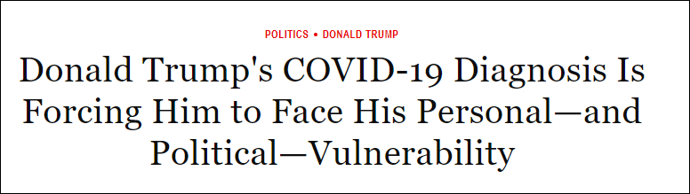 “近幾周,特朗普用強權欺壓國會、政治對手以及民主政權本身,同時對公共衞生條例嗤之以鼻,實際上也給病毒侵入他的身體以可乘之機。他會犧牲周圍的人、這個國家,甚至自己的身體健康……儘管他還在強撐,但很快就要為自己的政權書寫悼文。而我們以後再來回顧當下時,看到的,會是一個軟弱無比的前任總統。”