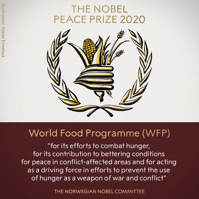 諾貝爾獎官方推特表示,新冠病毒大流行已導致世界飢餓受害者人數急劇上升。面對大流行病,2020年諾貝爾獎和平獎得主世界糧食計劃署已在加強遏制飢餓方面,顯示出令人印象深刻的能力。