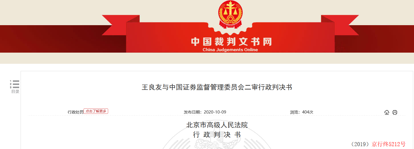 10月9日,中國裁判文書網披露了《王良友與中國證券監督管理委員會二審行政判決書》。
