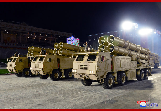 在本次夜間的盛大閲兵中,這幾款代表主體兵器工業尖端實力的武器也悉數亮相。首先亮相的就是基於太拖拉底盤的240毫米火箭炮,隨後朝鮮的300毫米遠程火箭炮、以及多個底盤的“超大口徑放射炮”也悉數登場。近年來朝鮮重視炮戰,發揚遠程精確打擊能力和信火一體打擊能力,而三種新型火箭炮無疑是“前線遠程炮兵”的部隊的核心。