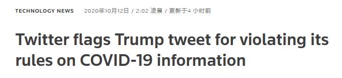 (觀察者網訊)當地時間10月11日,美國總統特朗普的一條推文被推特官方標記為“違反規則,即傳播與新冠肺炎相關的誤導性和潛在有害信息”。在這條免責聲明後,推特官方還補充道,考慮到公眾利益,它決定允許繼續訪問此推文。