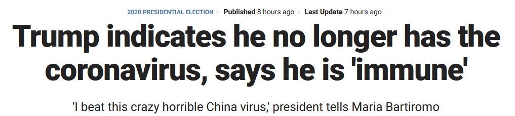 儘管研究表明仍有可能二次感染新冠病毒,但特朗普在當天接受福克斯新聞採訪中聲稱,他現在已經對新冠病毒“免疫”。