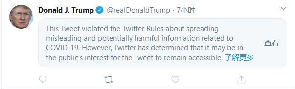 針對免責聲明,路透社援引推特的一位發言人消息,特朗普的上述推文是對新冠肺炎“誤導性的健康聲明”,與該推文的互動將“受到極大限制”,這是為此類情況設定的標準。