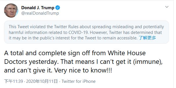 特朗普發推稱已“免疫”,推特將其標記為誤導性言論