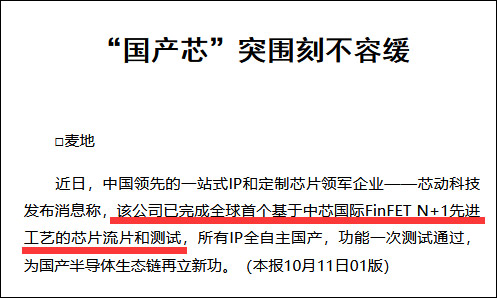 10月11日,珠海市委機關報《珠海特區報》報道,IP和定製芯片企業芯動科技已完成全球首個基於中芯國際FinFET N+1工藝的芯片流片和測試,所有IP全自主國產,功能一次測試通過。