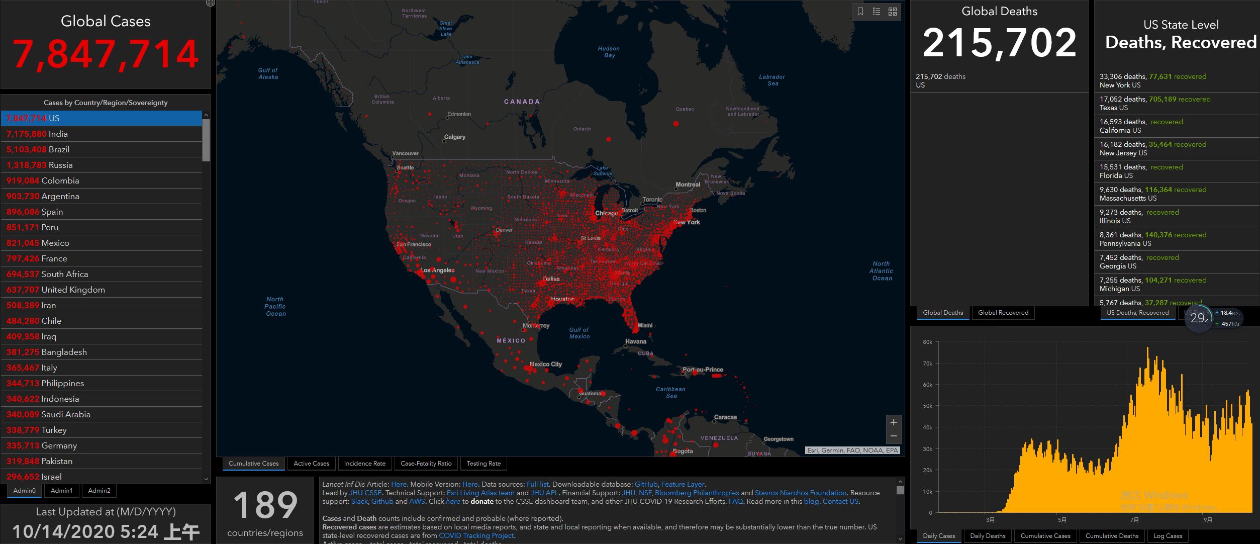(觀察者網訊)根據美國約翰斯·霍普金斯大學實時數據,截至北京時間10月14日5時24分,美國累計新冠確診病例達到7847714例,累計死亡達215702例,在過去24小時,美國新增確診病例51089例,新增死亡病例674例。