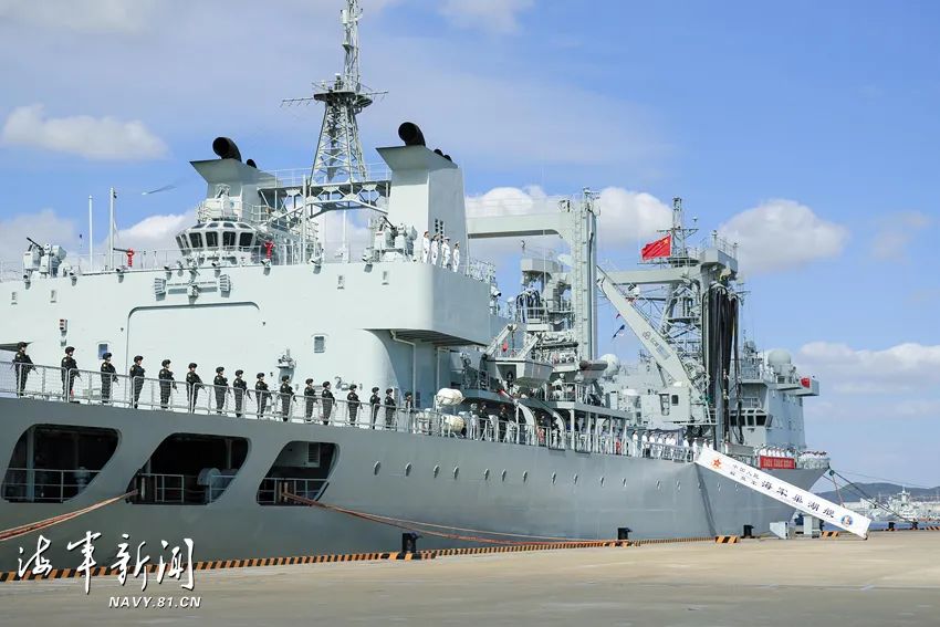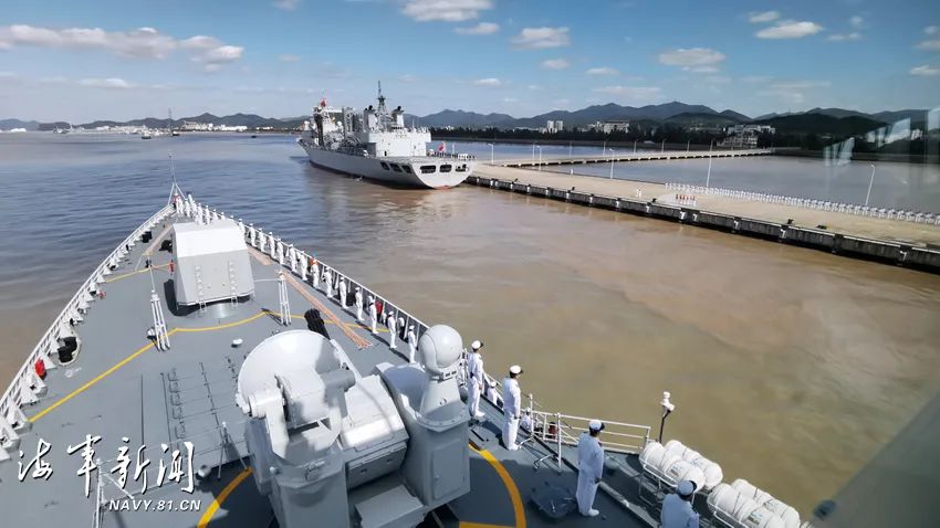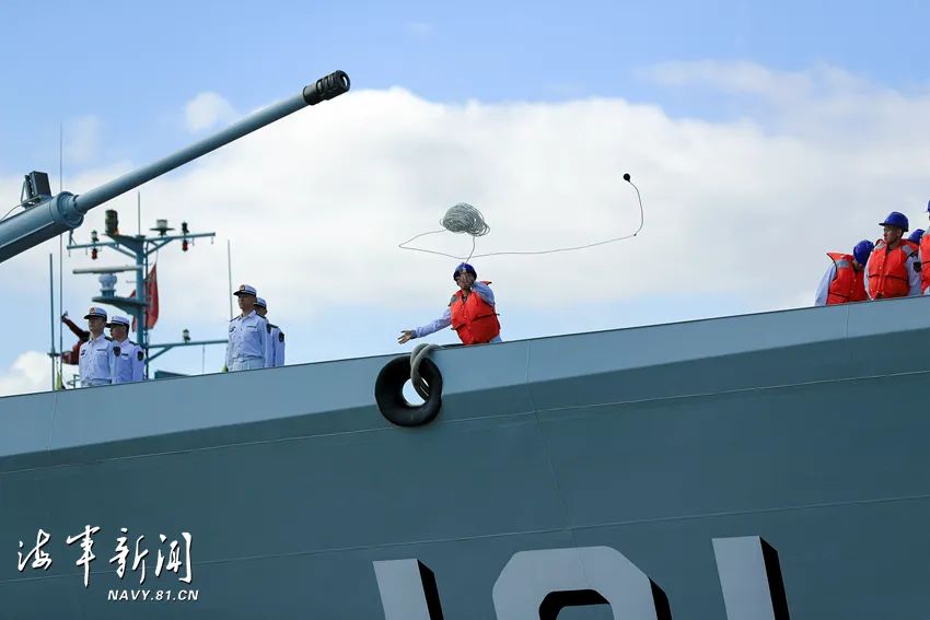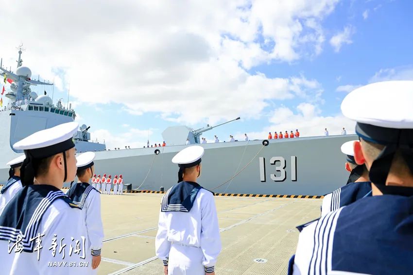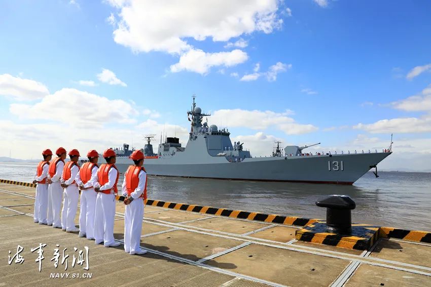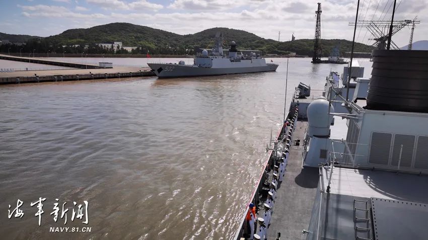 東部戰區海軍為護航編隊凱旋舉行了歡迎儀式。戰區海軍領導和官兵代表到碼頭迎接。