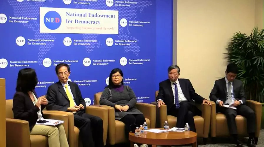李柱銘(左二)、麥燕庭(左三)、李卓人(右二)、羅冠聰(右一) 2019年5月14日在“美國國家民主基金會”作專題演講 。
