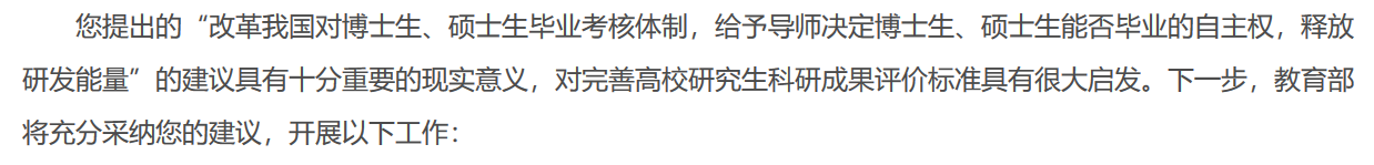 因此,教育部回應的其實是人大代表關於“改革畢業考核機制”以及“釋放研發能量”的部分。回應中沒有任何證據表明教育部將“給與導師決定博士生、碩士生能否畢業的自主權”。