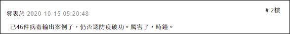 “已經46例病毒輸出病例了,仍否認防疫破功。厲害了,時中。”