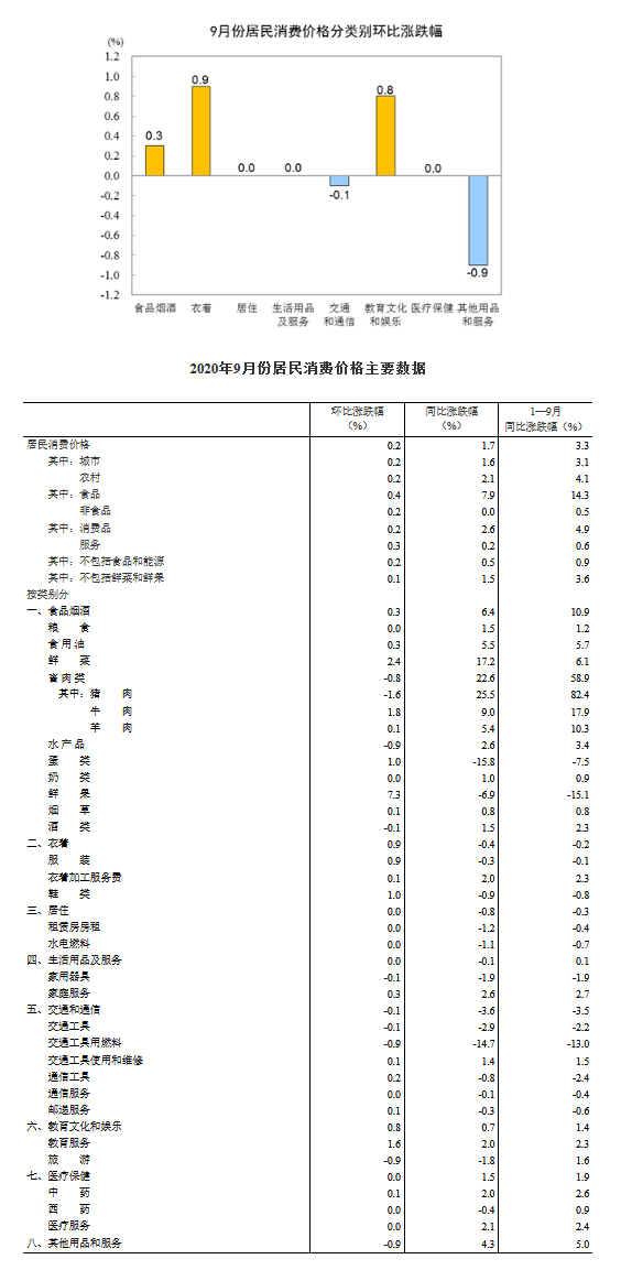 9月份,各地積極落實好“六穩”“六保”政策和常態化疫情防控措施,市場供需狀況總體穩定。從環比看,CPI上漲0.2%,漲幅比上月回落0.2個百分點。其中,食品價格上漲0.4%,漲幅比上月回落1.0個百分點,影響CPI上漲約0.09個百分點。食品中,受季節和節日等因素疊加影響,鮮果價格由上月下降0.4%轉為上漲7.3%;受季節因素及部分地區降雨影響,鮮菜價格繼續上漲2.4%,漲幅比上月回落4.0個百分點;**隨着生豬生產持續恢復,存欄不斷改善,儲備豬肉投放增多,豬肉供給有所增加,價格由上月上漲1.2%轉為下降1.6%。**非食品價格上漲0.2%,漲幅比上月擴大0.1個百分點,影響CPI上漲約0.14個百分點。非食品中,隨着文娛消費逐步恢復,觀影人數增加,電影票價格上漲4.1%;新學期開學,課外教育及部分民辦學校收費有所上漲,教育服務價格上漲1.6%;夏秋換季上新,服裝價格上漲0.9%。