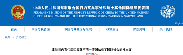 中國常駐日內瓦代表團網站10月14日消息,10月13日,美國國務卿蓬佩奧對中國、俄羅斯、古巴當選聯合國人權理事會成員進行大肆攻擊,並自吹自擂,將美國粉飾為“世界上一支向善的力量”,其厚顏無恥,讓人歎為觀止。蓬的言論暴露出其一貫的自負、霸道和虛偽,再次凸顯中美在人權問題上的根本差異。