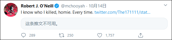 奧尼爾還在推特上説,“我清楚知道我擊斃了誰”,強調自己當年確實擊斃了本·拉登。