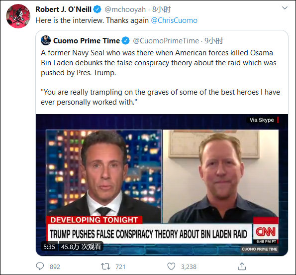 此後,曾參加“擊斃本·拉登”任務的美國第六海豹突擊隊(Seal Team 6)前隊員羅伯特·奧尼爾(Robert O’Neill)連發數條推特,對特朗普轉發的“陰謀論推文”進行了回擊。