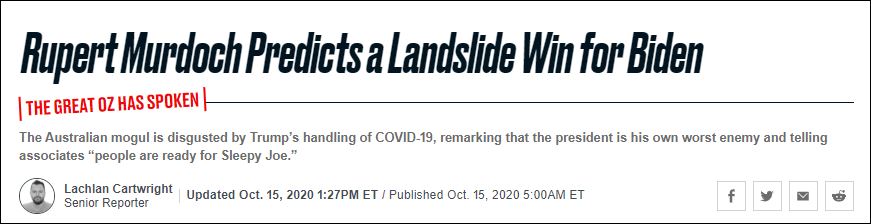 儘管旗下福克斯新聞等媒體,一直以來盡其所能在幫助特朗普連任,但默多克本人似乎對特朗普失去信心。默多克幾名親信稱,其實默多克本人已經確信,拜登將在11月3日的美國大選中壓倒性地擊倒特朗普。