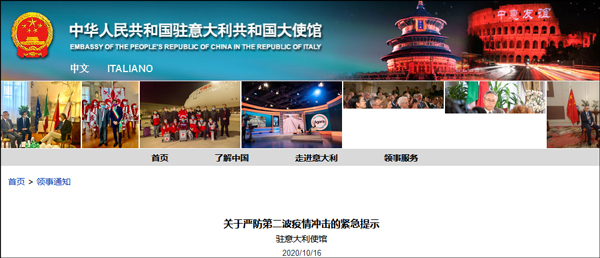 中國駐意大利共和國大使館網站10月16日消息,駐意大利大使館緊急提醒嚴防第二波疫情衝擊:
