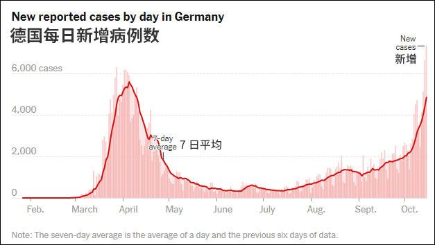 根據羅伯特·科赫研究所10月15日公佈的數據,德國新冠病例數在24小時內增加了6638例,累計超34萬例。這一增幅已經超過了疫情暴發初期3月28日的6294例,創下新高。