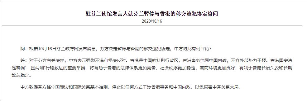 對於芬方決定暫停與香港之間引渡條約一事,我國駐芬蘭使館發言人於10月16日回應稱,對於芬方有關決定,中方表示強烈不滿和堅決反對。