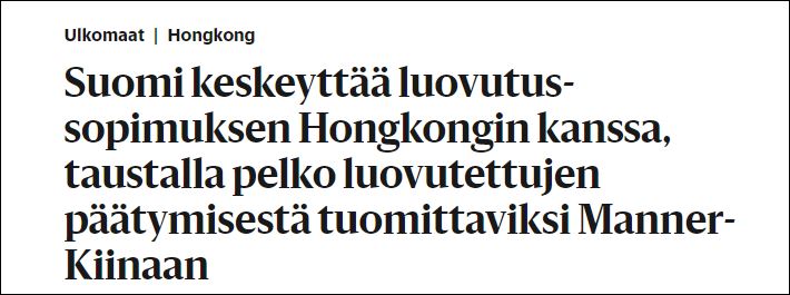 據芬蘭《赫爾辛基日報》(Helsingin Sanomat)報道,芬蘭總統尼尼斯托(Sauli Niinistö)在一份政府公告中稱,他於16日批准了司法部關於暫停芬蘭與香港特別行政區之間移交逃犯協定的建議。