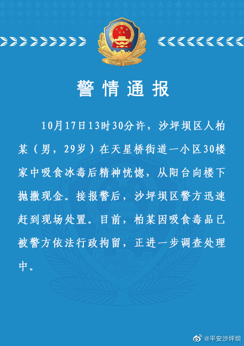 10月17日晚,重慶市公安局沙坪壩區分局官方微博發佈通報,當天13時30分許,沙坪壩區人柏某(男,29歲)在天星橋街道一小區30樓家中吸食冰毒後精神恍惚,從陽台向樓下拋撒現金。接報警後,沙坪壩警方迅速趕到現場處置。目前,柏某因吸食毒品已被警方依法行政拘留,正進一步調查處理中。