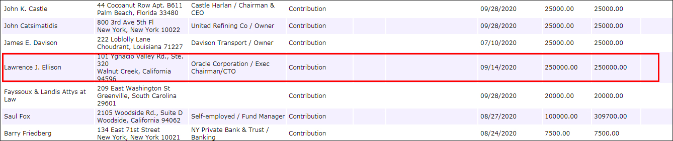 埃裏森14日向格雷厄姆的超級政治行動委員會捐款25萬美元 截圖:美國聯邦選舉委員會