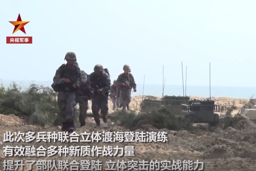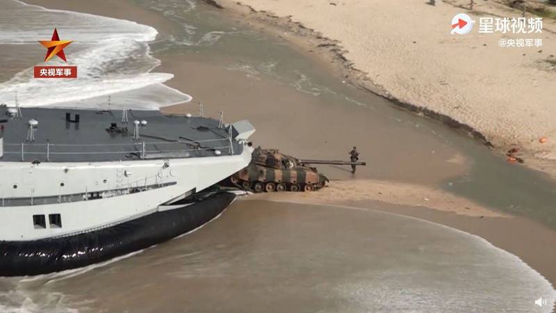 央視軍事15日放出的解放軍搶灘登陸視頻中,兩棲裝甲車漂浮在海面上,相繼進入071型綜合登陸艦,氣墊登陸艇上則載着戰車,對目標灘頭實施登陸,解放軍士兵以戰車作為掩護,朝目標物挺進。