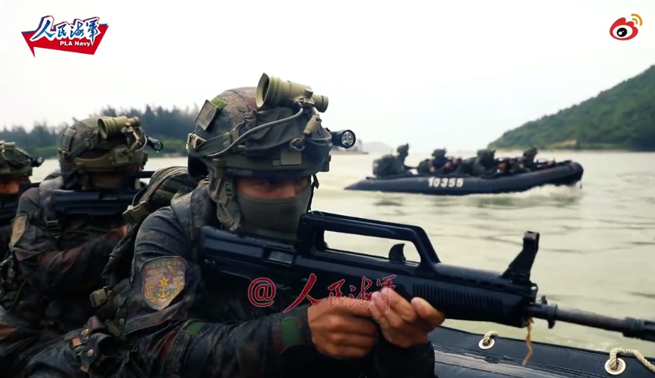 親綠媒體《自由時報》15日報道稱,在@人民海軍放出的一段視頻中,“蛟龍突擊隊”兵分3路,乘坐快艇、直升機與潛水突擊目標小島,從岸上潛入後,配合直升機垂降部隊對目標物實施爆破任務,並消滅岸防哨口,摧毀敵軍部署的導彈,最後進入敵軍陣營進行攻堅。