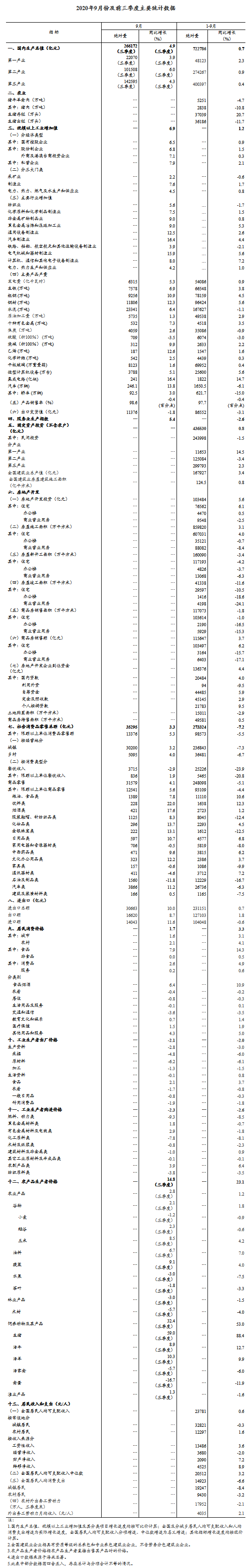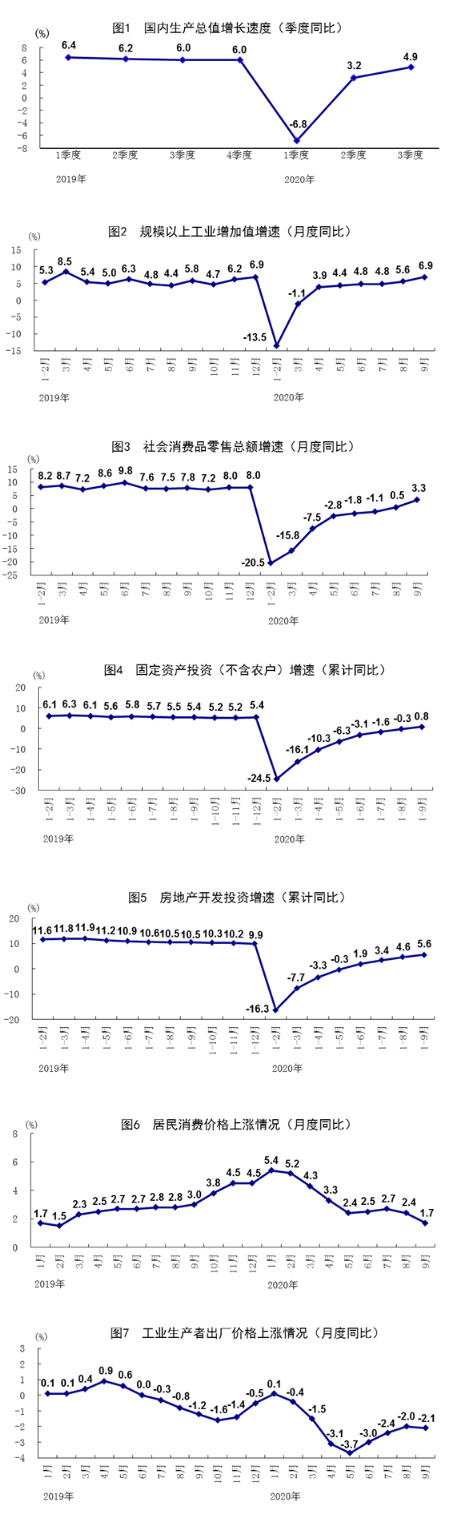 國家統計局網站10月19日消息,前三季度,面對新冠肺炎疫情巨大沖擊和複雜嚴峻的國內外環境,在以習近平同志為核心的黨中央堅強領導下,各地區各部門科學統籌疫情防控和經濟社會發展,有力有效推動生產生活秩序恢復,前三季度經濟增速由負轉正,供需關係逐步改善,市場活力動力增強,就業民生較好保障,國民經濟延續穩定恢復態勢,社會大局保持穩定。