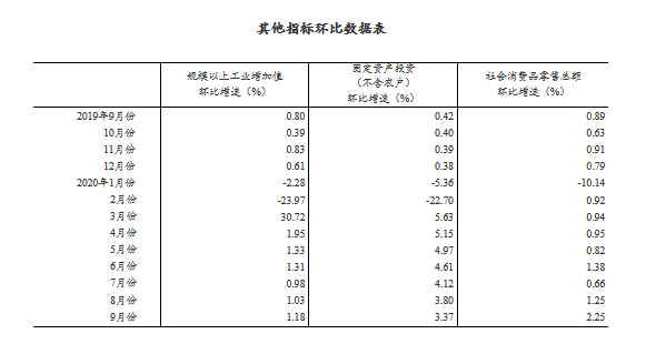 (2)根據季節調整模型自動修正結果,對近一年來各期國內生產總值、規模以上工業增加值、固定資產投資(不含農户)、社會消費品零售總額環比增速進行修訂。修訂結果及2020年三季度GDP環比數據、2020年9月份其他指標環比數據如下: