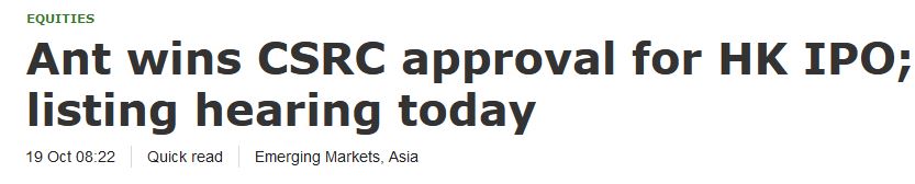 10月19日,路透社旗下媒體IFR援引未具名知情人士報道稱,螞蟻集團香港首次公開發行(IPO)獲得中國證監會批准,今日舉行上市聆訊。螞蟻集團計劃週一尋求香港交易所的批准。