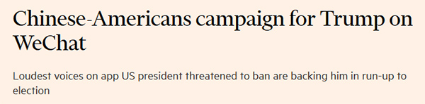 當地時間10月18日,《金融時報》發表了一篇題為“美國華人在微信上給特朗普拉票”的報道,稱大批華人正利用微信平台給特朗普拉票,“這個被特朗普打壓的應用上支持特朗普的呼聲反而更高”。