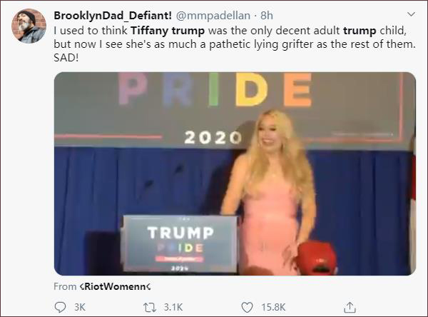 據“今日美國”新聞網報道,不少性少數團體對蒂凡尼的言論表示不滿,因為其父雖然很少公開發表有關“LGBTQ”的言論,但是特朗普曾經頒佈禁令,禁止變性人羣體參軍,還推翻了奧巴馬時代保護變性人學生上公立學校的舉措。