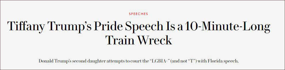 【文/觀察者網 鞠峯】尷尬的表情,尷尬的肢體動作,尷尬地漏掉了“LGBTQIA+”性少數羣體中的“T”,尷尬地吹捧自己爸爸特朗普對維護性少數羣體做出的“努力”……這場10分鐘的演講,尷尬“到家了”。美國媒體直言,特朗普小女兒蒂凡尼·特朗普上週六的助選活動堪比“車禍現場”。