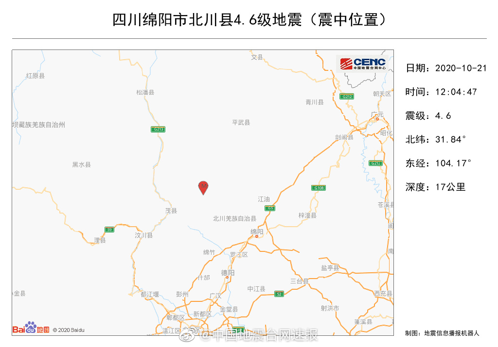 據@中國地震台網速報 消息,中國地震台網正式測定:10月21日12時04分在四川綿陽市北川縣(北緯31.84度,東經104.17度)發生4.6級地震,震源深度17千米。震中距北川縣14公里,距綿陽市64公里,距成都市133公里,當地網友反饋説震感明顯。