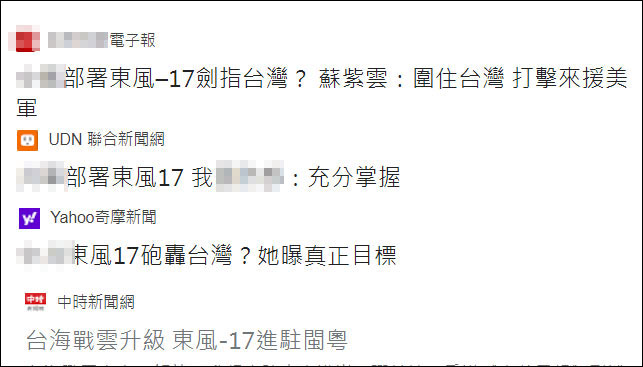 《南華早報》有關東南沿海部署東風-17的報道也引發了台媒的關注,台灣媒體再度炒作中國大陸東南沿海導彈的話題,稱解放軍部署了更加先進的導彈,以“對台灣施壓”,是為“攻擊台灣做準備”。