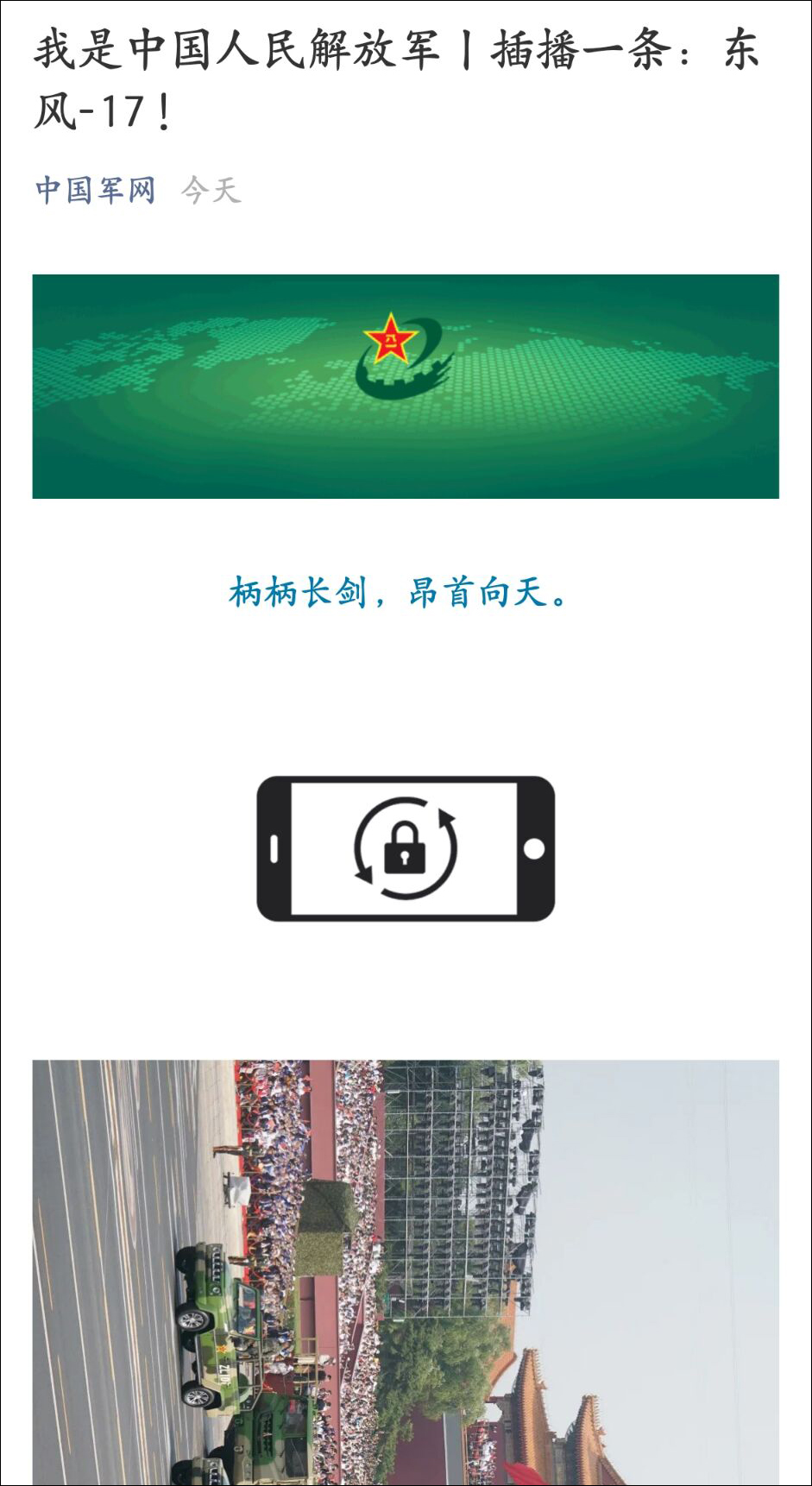 中國軍網微信公眾號10月20日發佈稿件,題為“我是中國人民解放軍丨插播一條:東風-17!”,全文均是國慶70週年閲兵時,東風-17方隊受閲照片。在精選評論區,有網友稱“懂的都懂”。