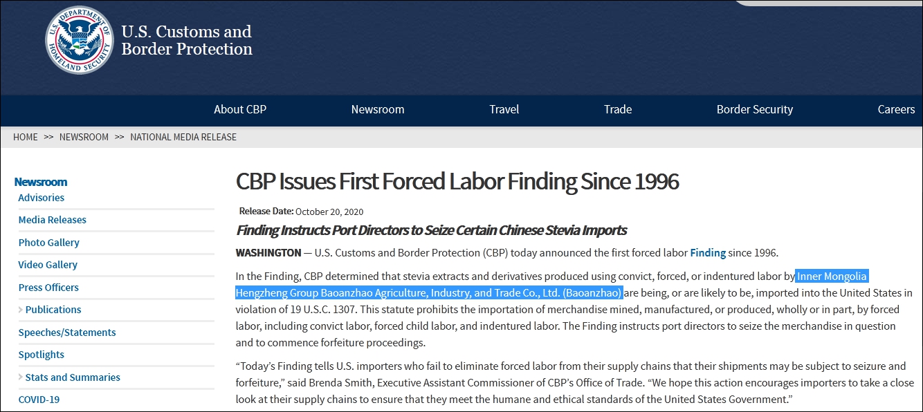 10月20日,美國海關與邊境保護局(CBP)聲稱,他們有“確鑿”證據可以證明,一家位於中國內蒙古的企業在使用強制勞工生產甜菊糖(一種代糖,用於可樂等飲料),為此他們已經啓動正式程序,指示美國港口沒收相關貨物。