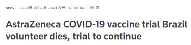 (觀察者網訊)當地時間10月21日,路透社報道,巴西國家衞生監督局(Anvisa)發佈消息稱,該國一名參加新冠疫苗試驗的志願者死亡,該疫苗由阿斯利康和牛津大學合作研發,但“出於道德和隱私考慮”沒有披露死亡原因。