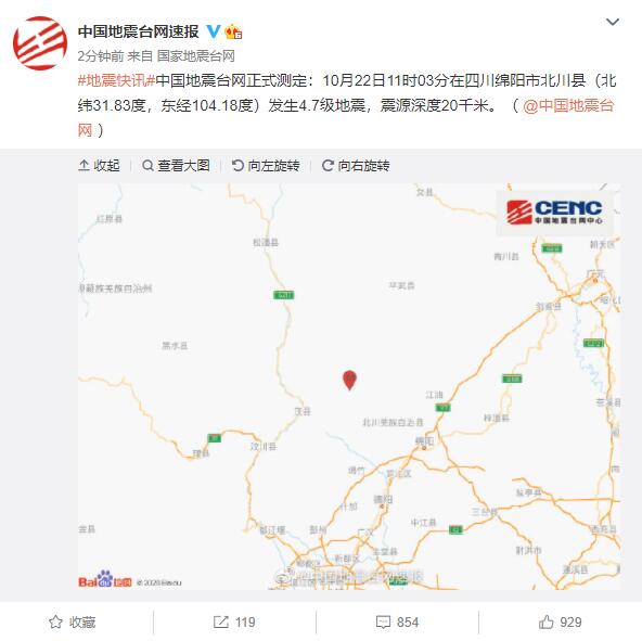 四川綿陽市北川縣發生4.7級地震,震深20千米 None 2020-10-22 據@地震台網速報 消息,中國地震台網正式測定:10月22日11時03分在四川綿陽市北川縣(北緯31.83度,東經104.18度)發生4.7級地震,震源深度20千米。