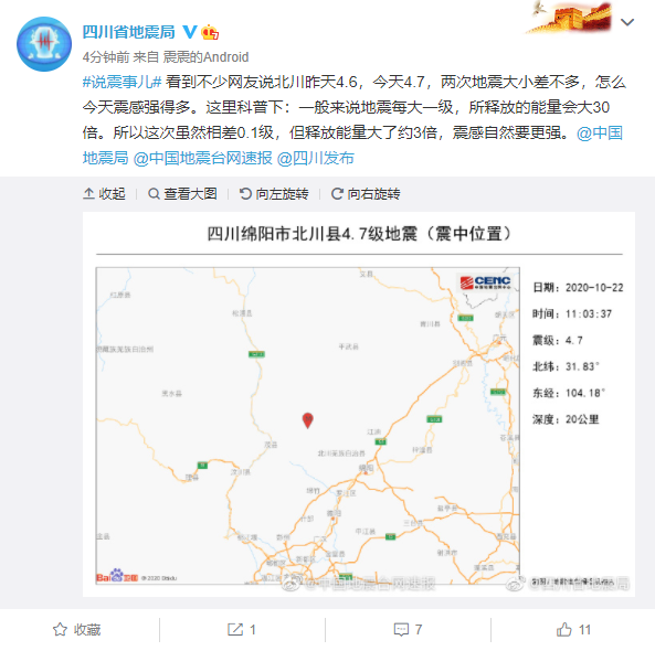四川地震局:今日北川地震釋能比昨日大約3倍 None 2020-10-22 看到不少網友説北川昨天4.6,今天4.7,兩次地震大小差不多,怎麼今天震感強得多。這裏科普下:一般來説地震每大一級,所釋放的能量會大30倍。所以這次雖然相差0.1級,但釋放能量大了約3倍,震感自然要更強。