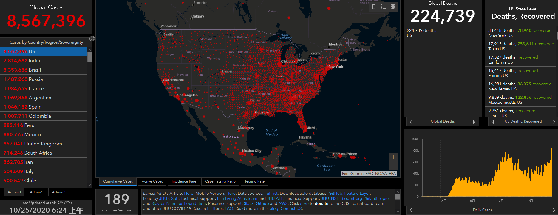 根據美國約翰斯·霍普金斯大學實時數據,截至北京時間10月25日6時24分,美國累計新冠確診病例8567396例,累計死亡224739例。過去24小時,美國新增確診病例90335例,新增死亡病例926例。