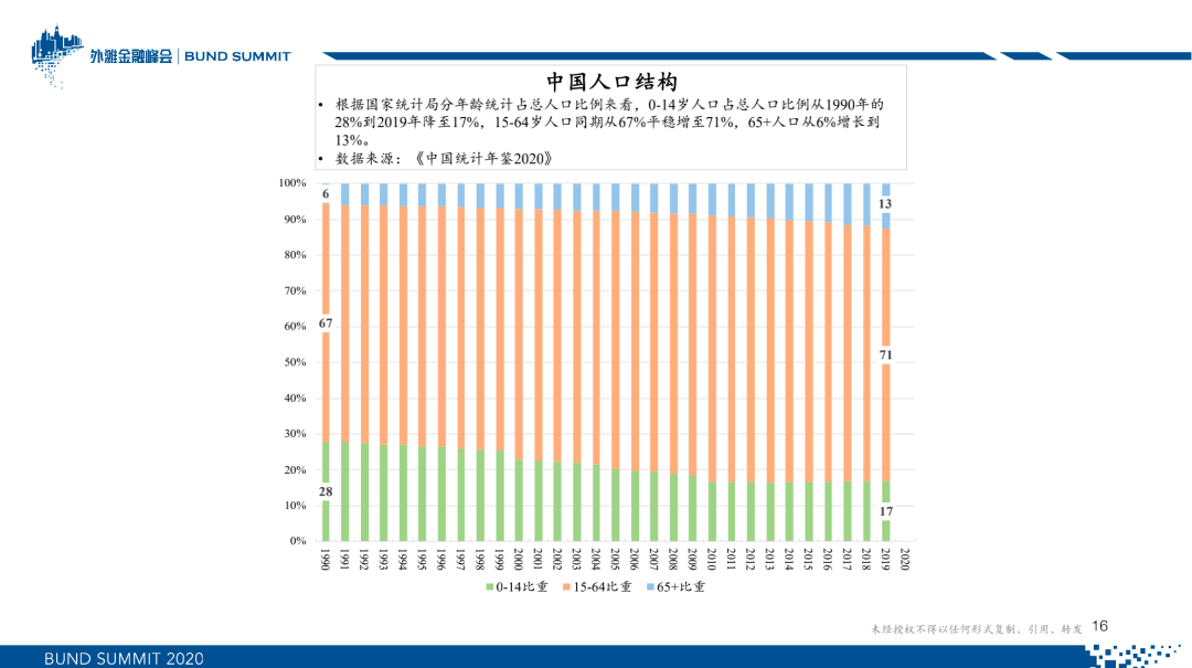 這張圖是從分年齡人口數佔總人口數比例來看來看,0-14歲人口占總人口比例從1990年的28%到2019年降至17%,15-64歲人口同期從67%平穩增至71%,65+人口從6%增長到13%。
