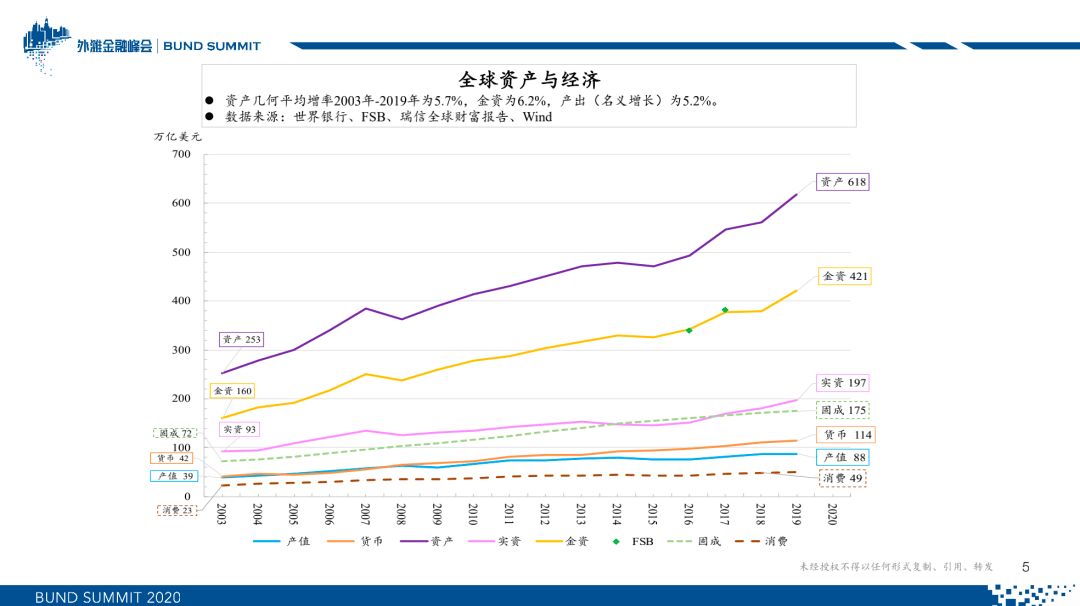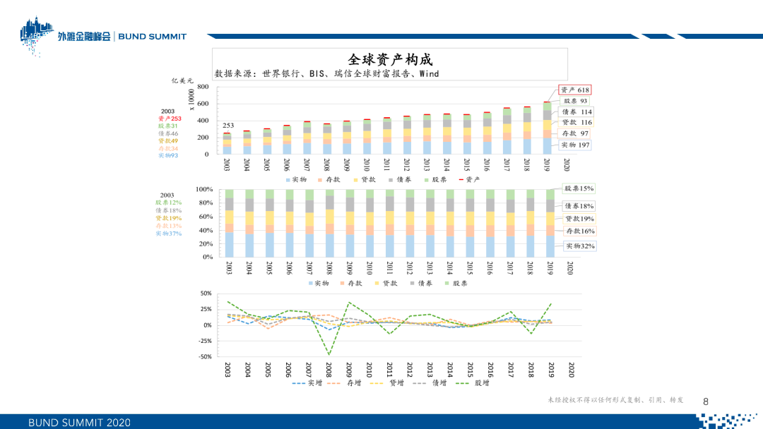 2003年的253萬億美金,到了2019年618萬億,這裏面其實是包括實物資產(2003年93萬億,2019年197萬億)和金融資產(2003年160萬億,2019年421萬億)。實物資產有一個簡單的測算方法同時也是一個重要的基本概念,就是全世界的固定資產形成實際上就是實物資產,同時也是權益(Equity),全世界的權益資產實際上是真正的實物積累。而金融資產分為銀行類的資產和非銀的金融資產。這是一個金融總資產的概念。