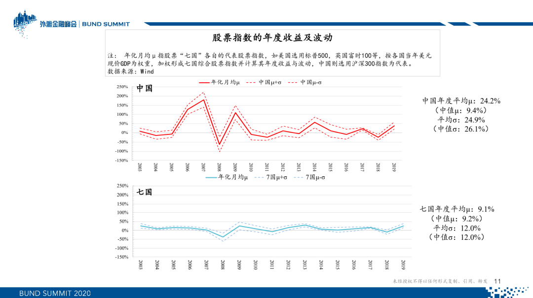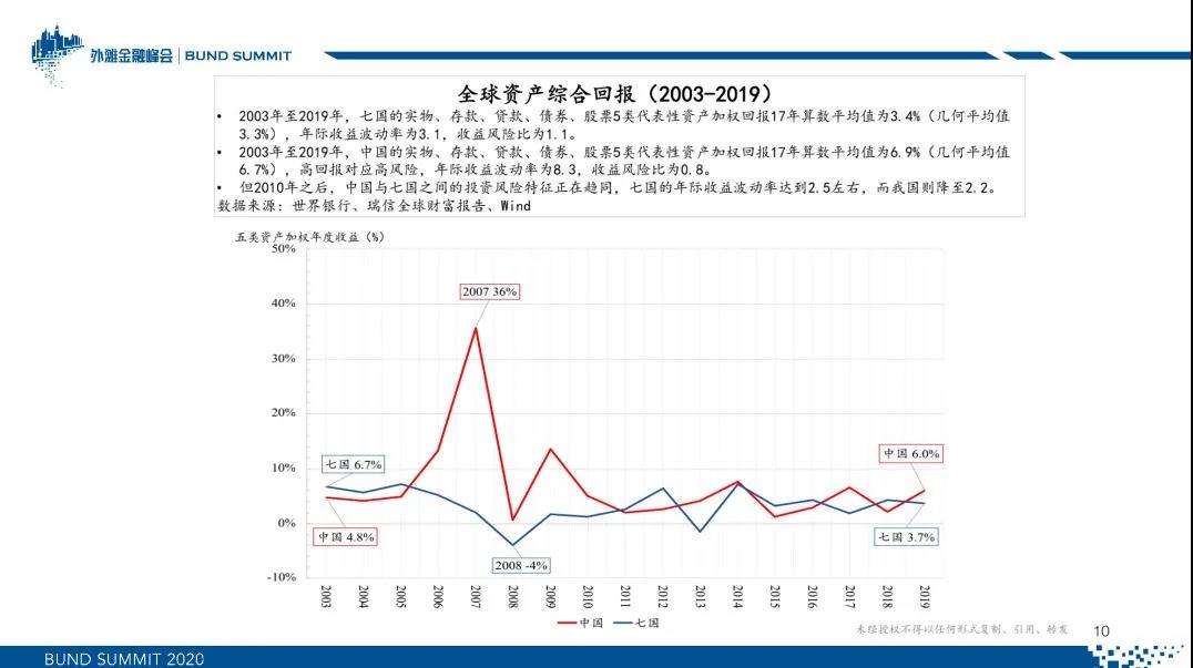 我再來從回報看看,中國(紅線)特別是早期(2003-2010年)資產回報比較高,但是波動非常大,相對七國(G7)回報比較低,但是波動性比較小,從收益風險比或者夏普比率來講的話,國外的比例會更高一點。