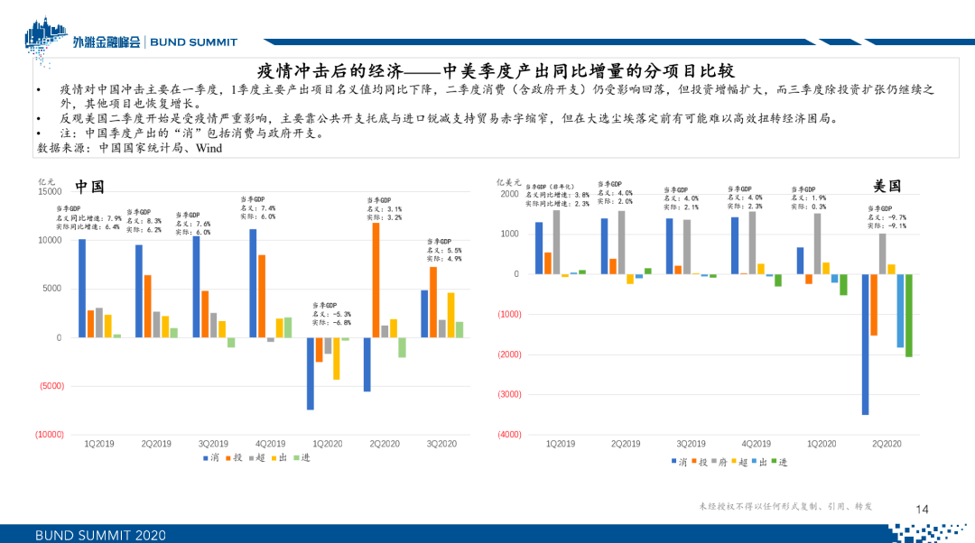 我們再來看一下疫情對中美經濟的衝擊,左邊是中國,右邊是美國,前面四個季度你可以看中國有三個季度,美國現在只有兩個季度。疫情對我們的衝擊,主要是在第一個季度。我們這裏可以看出消費投資的變化,消費投資第一季度都是下降的,第二個季度,其實消費還是在下降,但是投資在大規模上升,這樣使得第二個季度的整體增長已經開始轉正,到第三個季度我們可以看得更清楚,消費也有了相當的恢復,這跟我們生活中間看到的情況也是吻合的。那麼你看美國的情況,第一個季度,它的投資也在下降,主要靠政府開支來支撐經濟狀況,然後第二個季度消費投資都在大幅下降,仍然主靠政府開支來支撐經濟,第三個季度情況還沒出來。