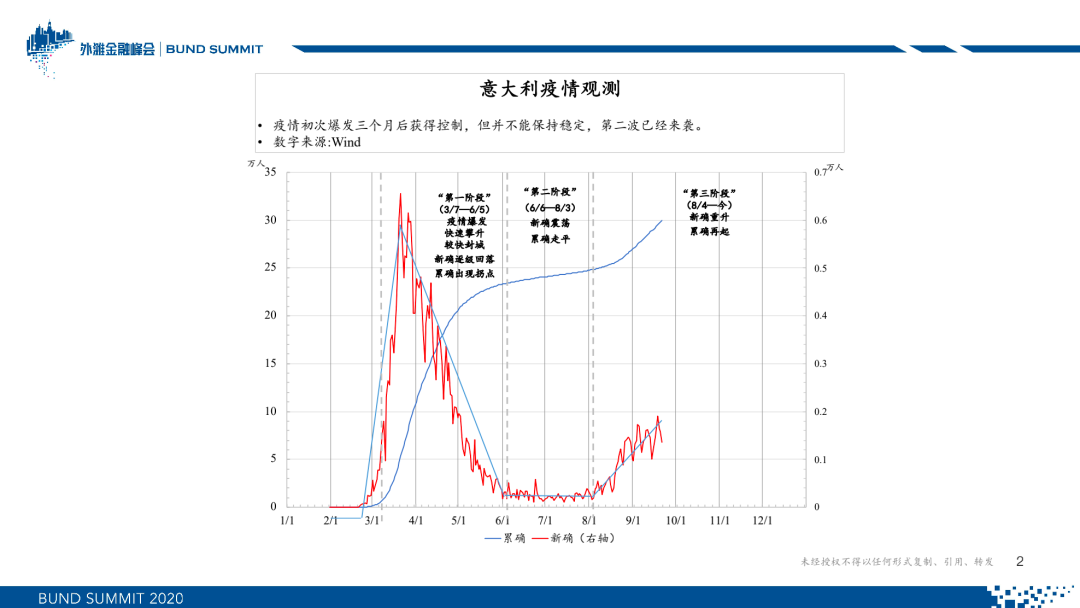 大家講到第二波疫情,可以看下面這張意大利疫情觀測圖。紅線代表意大利的新確數,它也是呈現迅速上去、下來的趨勢,但過程三個月的時間,然後又持續了差不多兩個月的時間基本上控制住了,但是明顯可看出8月初又開始出現第二波疫情反覆。這也是剛才我們説的經濟問題糾結,你要抗疫,要防疫,最有效的就是Shut down,這一關什麼都好了,但是對經濟的衝擊太大了,所以總是在這樣一個要麼疫情的擴散,要麼經濟的停轉中糾結,這是意大利的疫情狀況。