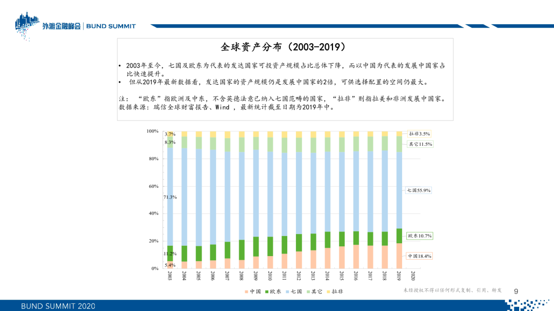 如果我們從世界國別分佈來看資產,可以看到中國的資產從2003年的資產世界佔比5%左右,到現在將近20%,還是有了一個很系統的增長。相反,七國(G7)的佔比從70%左右降到了56%,這是大致資產分佈的一個結構組成概念。時間有限就不展開了。