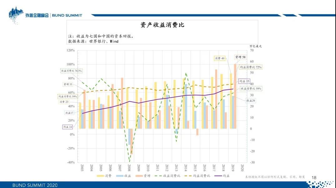 最後一張圖我們來看看世界的資產、收益和消費比例,600多萬億美元的資產規模,而資產又會產生收益,如果説我們這些收益是為了生活和養老,那麼把收益的總體水平跟消費的水平去比較一下,也就是綠色虛線,這就是估測的每年收益跟當年的消費水平的比例,可以看出來高的時候甚至可以達到80%多。